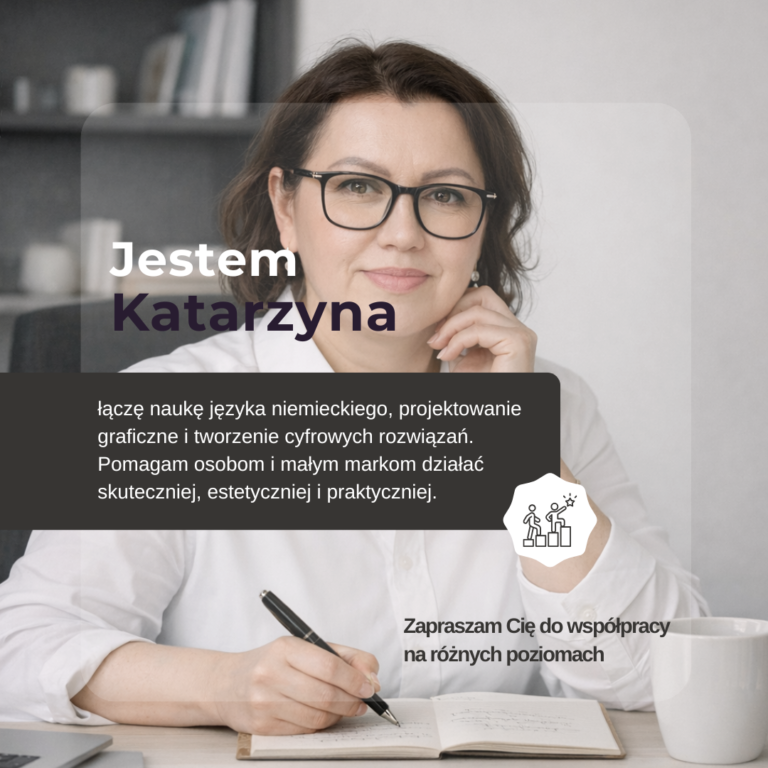 Język niemiecki towarzyszy mi zawodowo od ponad dwóch dekad. Nauczam, tworzę e-booki, materiały edukacyjne i wspieram innych w komunikacji. Z czasem połączyłam to z pasją do estetyki i projektowania. Zaczęłam tworzyć grafiki, które pomagają wyróżnić się w sieci i budować rozpoznawalność początkujących marek.